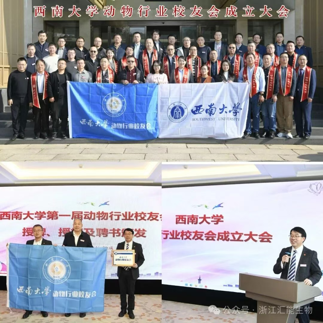 2025年11月15日,西南大学动物行业校友会在江苏无锡正式成立。西南大学党委常委副校长葛信勇教授、原副校长王永才教授等学校领导,以及来自全国各地的动物行业校友代表齐聚一堂,共同见证这一重要时刻。经大会选举,浙江汇能汇能生物股份有限公司董事长陈贵才教授当选为本届校友会会长。