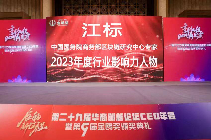 其中主持人宣布,江标:中国国务院商务部区块链研究中心专家委员获评第九届金鸥奖2023年度行业影响力人物奖。