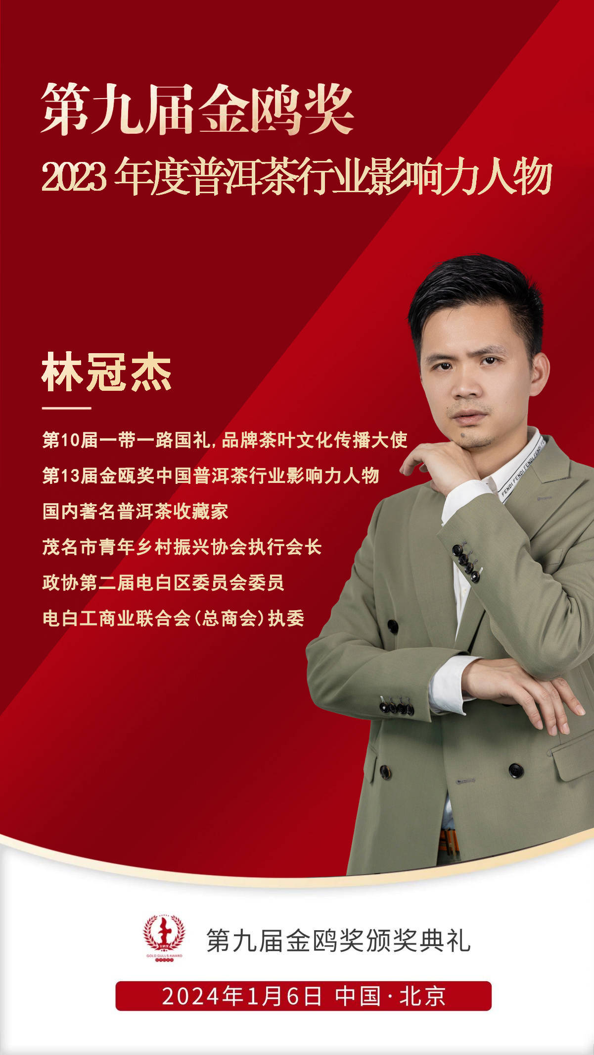 在企业家论坛的举荐下,基于梅振华先生于企业管理领域多年来的专业授课、研究成果和众多卓有成效的企业管理系统升级成功案例,以及其企业发展过程中体现的卓越创新力和良好的经营管理数据,在颁奖盛典中主持人宣布:论聘号(勐海)有限公司董事长林冠杰先生获评“第九届金鸥奖2023年度普洱茶行业影响力人人物”殊荣。