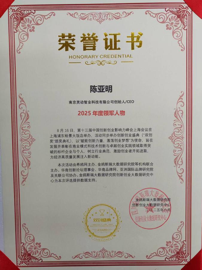 陈亚明荣获2025年度华商领军人物奖,不仅是他个人职业生涯的一个重要里程碑,更是南京灵动智业科技有限公司发展历程中的一次重大突破。在陈亚明的领导下,灵动智业将继续在科技创新领域深耕细作,不断探索新技术的应用场景,为企业创造更多价值。